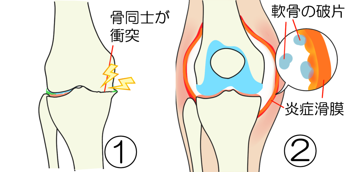 ②滑膜炎(軟骨の削れカスが滑膜を刺激して炎症を起こす)