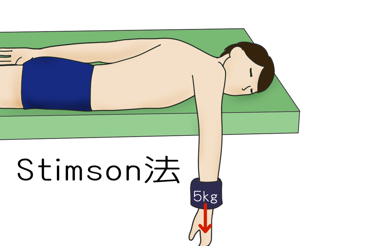 ベッドにうつぶせに寝た状態で、脱臼した方の腕に5kg程度の錘をぶらさげ、ベッドの横から下垂させます。